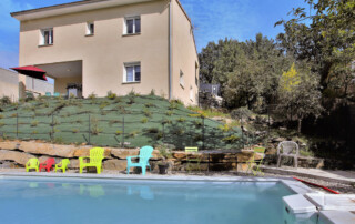 Le gîte est situé à l’orée des bois, sur les hauteurs de Vesseaux, dans le parc Naturel Régional des Monts d’Ardèche.